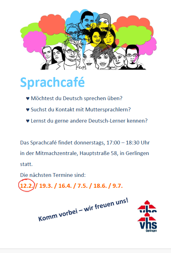 Sprachcafe im Hirsch: 19.03, 16.04., 07.05., 18.06., 09.07. 2026